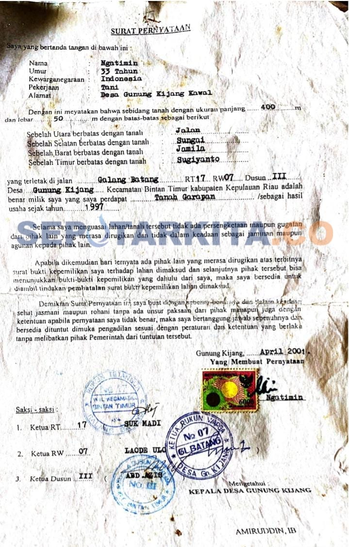 BINTAN (eska) – Ketua RW 07 RT 017 Desa Gunung Kijang, Ngatimin, membantah keras tudingan yang menyebut aktivitas pengerukan lahan di wilayahnya masuk dalam kawasan hutan lindung atau dilakukan secara ilegal.