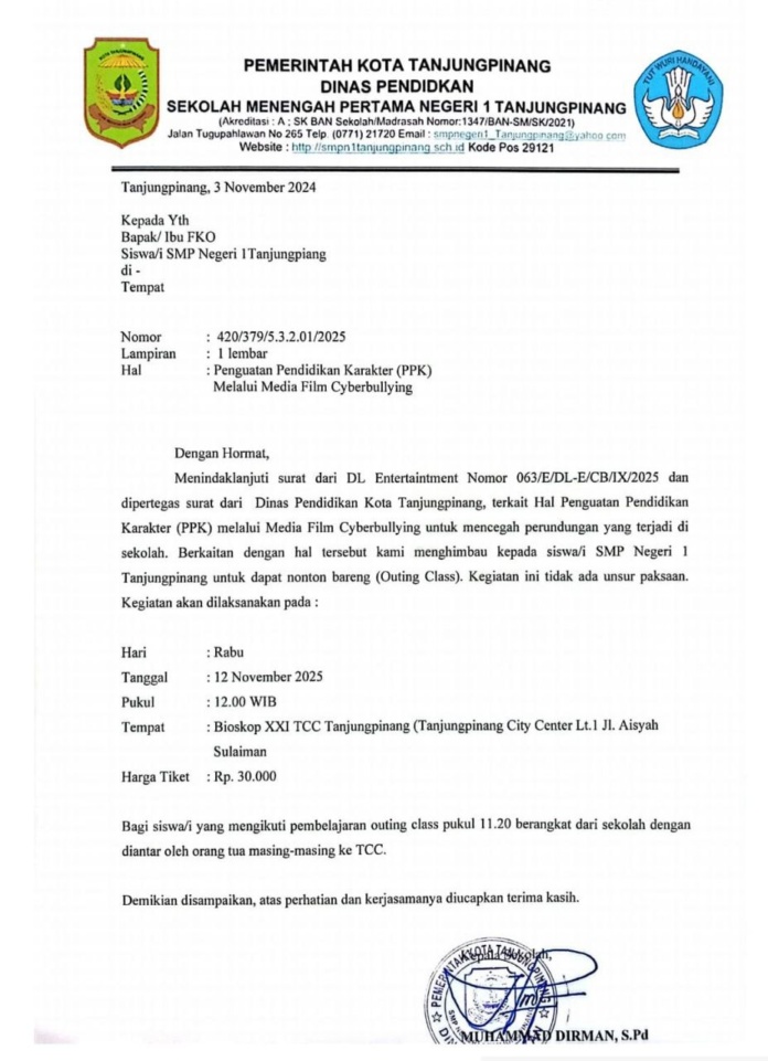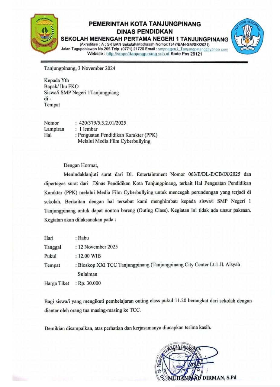 Tanjungpinang (eska) – SMPN 1 Tanjungpinang, menerbitkan surat pemberitahuan, tentang nonton bareng (nobar) film Cyberbullying, di Bioskop TCC Tanjungpinang, Rabu (12/11/2025) mendatang.