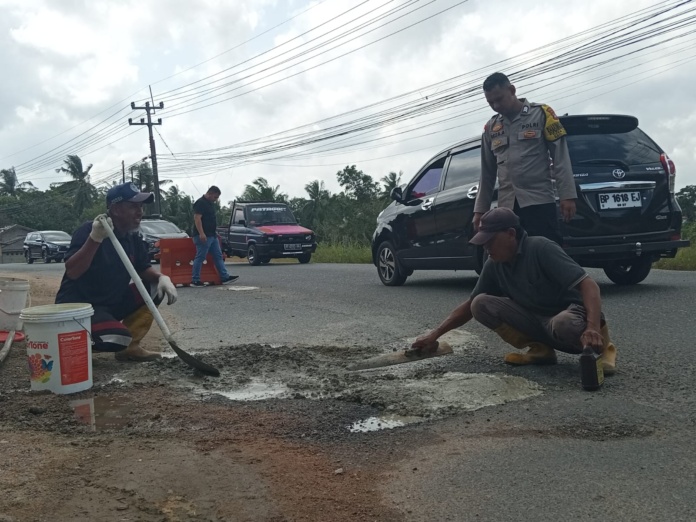 Bintan (eska) – Guna meminimalkan risiko kecelakaan lalu lintas, Polsek Gunung Kijang melakukan perbaikan mandiri pada jalan berlubang di kawasan Jalan Wisata Bahari Kawal, Kabupaten Bintan, Kamis (22/01).
